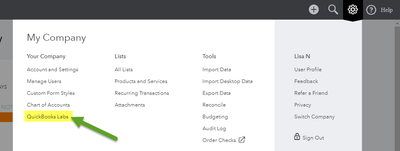 ane. Click on the Gear icon in the upper right corner and select QuickBooks Labs